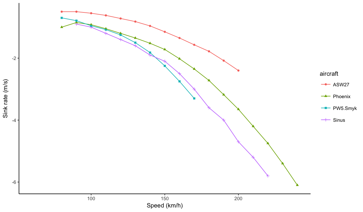 shams42 Posted April 10, 2017 Report Posted April 10, 2017 I made a figure comparing the published polars from the Phoenix against the Sinus, the PW-5, and the ASW-27. I got the numbers from the figures published in the POHs, and I have doubtlessly introduced some interpolation errors. I've attached the Excel spreadsheet I used as well as a plot of the data (produced using R / ggplot2). I hope you find this interesting. The result seems to indicate (to me, at least) that the Phoenix is quite a capable glider. Benchmarking against the ASW-27 is silly, of course, but I wanted to see how much it gives up against a high-performance pure glider. A more even comparison would pit the Phoenix against other two-seat gliders. polar_comparison.xlsx Quote