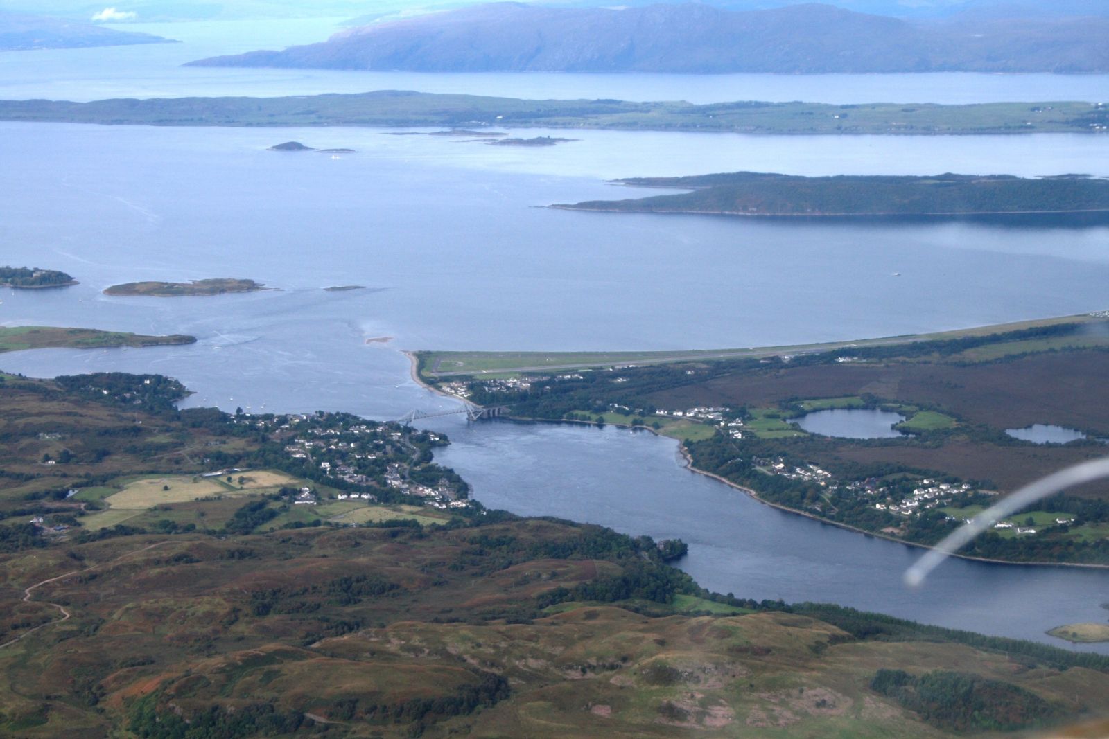 Oban airport looking west. The main stretch of water is the Firth of Lorne.