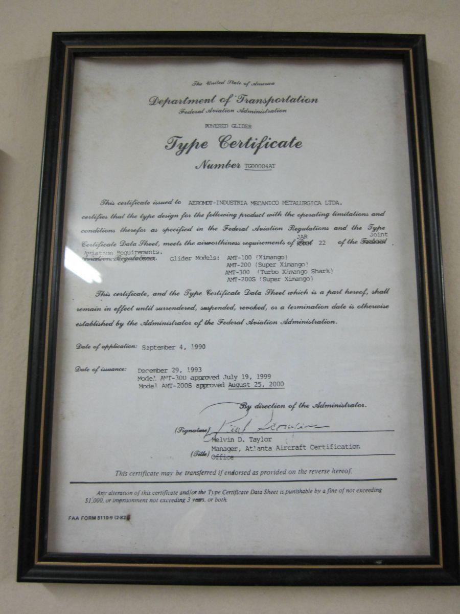 The US Type Certificate, along with Type Certificates for 25 other countries, were proudly displayed in the Aeromot conference room.